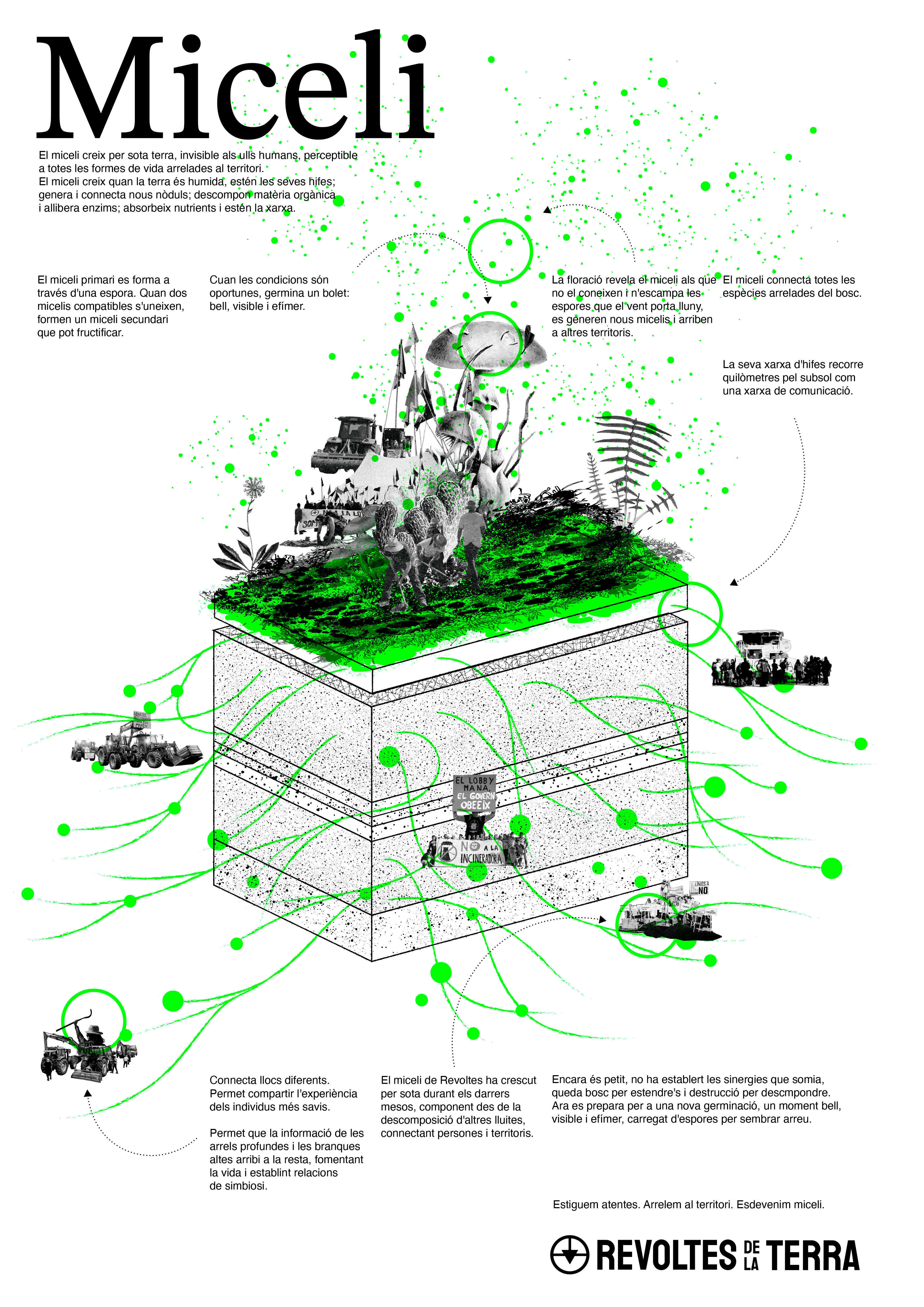 El miceli de revoltes ha seguit creixent per sota durant els darrers mesos, composant des de la descomposició de l’experiència, dels processos i resultats d’altres lluites, connectant persones i territoris i trobant-se amb altres micelis de defensa del territori per fer possible noves germinacions. Encara és un miceli petit, encara no ha establert les sinergies que somia amb altres lluites, encara queda molt bosc per estendre’s, altres micelis amb qui hibridar-se i molta destrucció per descompondre.